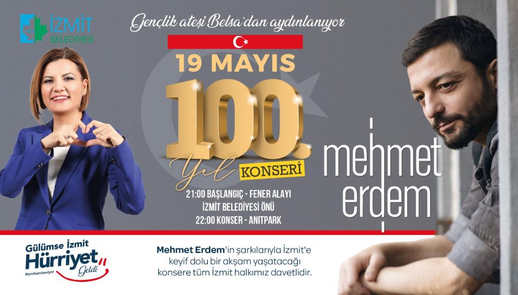 İzmit Belediyesi tarafından düzenlenen program kapsamında ünlü sanatçı Mehmet Erdem, İzmitlilere 100. yıl coşkusu yaşatacak. 19 Mayıs Pazar günü saat 21.00’de Belsa önündeki buluşmada yakılacak meşalenin ardından fener alayı eşliğinde Anıt Parka yürünecek. Anıtpark’taki program ünlü sanatçı Mehmet Erdem’in konseriyle devam edecek