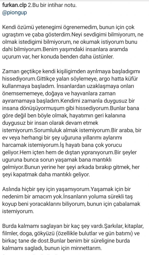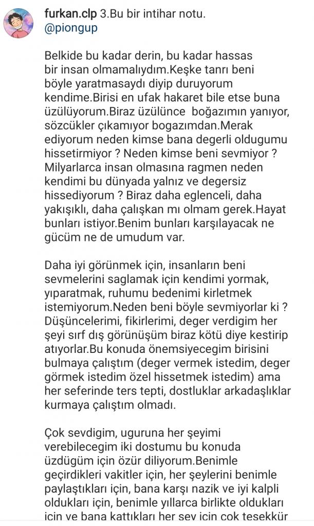 Kocaeli Darıca İlçesinde ikamet eden ve bir kargo firmasında çalıştığı öğrenilen 18 yaşındaki Furkan Celep, önceki gün(Çarşamba) akşam saatlerine sosyal medya adresinde peş peşe 3 maddeden oluşan intihar mektubu paylaştı.