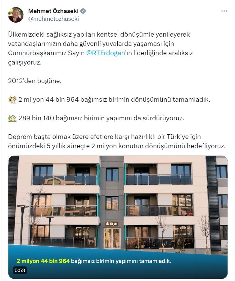 Bakan Özhaseki, konu ile ilgili Twitter hesabından yaptığı açıklamada şu ifadelere yer verdi: “Ülkemizdeki sağlıksız yapıları kentsel dönüşümle yenileyerek vatandaşlarımızın daha güvenli yuvalarda yaşaması için Cumhurbaşkanımız Sayın Recep Tayyip Erdoğan’ın liderliğinde aralıksız çalışıyoruz. 2012’den bugüne, 2 milyon 44 bin 964 bağımsız birimin dönüşümünü tamamladık. 289 bin 140 bağımsız birimin yapımını da sürdürüyoruz. Deprem başta olmak üzere afetlere karşı hazırlıklı bir Türkiye için önümüzdeki 5 yıllık süreçte 2 milyon konutun dönüşümünü hedefliyoruz.”