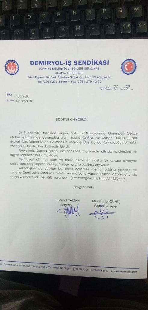 Demiryol-İş Sendikası, üyelerine yönelik yapılan olayı yaptığı açıklamayla şiddetle kınadı. Açıklamada, ‘Üyelerimiz Recep Çoban ve Şaban Furuncu Darıca Farabi Hastanesi’nde müşahede altında tutulmaktadır. Bunu yapanların adalet önünde hesap vermeleri için her türlü yasal desteği vereceğiz’ denildi.