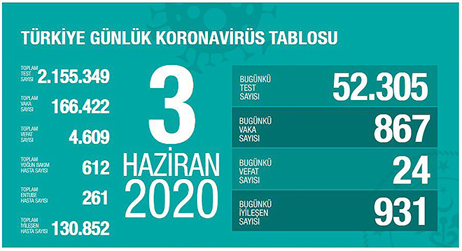 Sağlık Bakanlığı, korona virüs salgınıyla ilgili son verileri paylaştı. Yapılan açıklamaya göre son 24 saatte 24 kişi hayatını kaybederken, 867 yeni hasta tespit edildi.