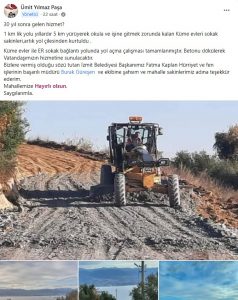 Ümit Yılmaz, “1 kilometrelik yolu yıllardır 5 kilometre yürüyerek okula ve işine gitmek zorunda kalan Küme Evler Sokak sakinleri artık yol çilesinden kurtuldu. Küme Evler ile Er Sokak bağlantı yolunda yol açma çalışması tamamlandı. Betonu dökülerek vatandaşımızın hizmetine sunulacak. Bizlere vermiş olduğu sözü tutan İzmit Belediye Başkanımız Fatma Kaplan Hürriyet’e ve fen işlerinin başarılı müdürü Burak Güreşen ve ekibine, şahsım ve mahalle sakinlerimiz adına teşekkür ederim. Mahallemize hayırlı olsun” dedi.