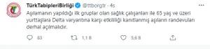 TTB, sosyal medya hesabından, “Aşılamanın yapıldığı ilk gruplar olan sağlık çalışanları ile 65 yaş ve üzeri yurttaşlara, Delta varyantına karşı etkililiği kanıtlanmış aşıların randevuları derhal açılmalıdır” paylaşımı yaptı.