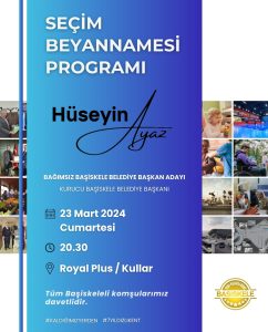 Bağımsız Başiskele Belediye Başkan Adayı Hüseyin Ayaz, Başiskeleliler’in büyük desteği altında çalışmalarını yürütüyor. Başiskele’de en iddialı aday durumuna gelen Hüseyin Ayaz, seçim beyannamesini açıklıyor. Ayaz’ın seçim beyannamesi programı Royal Plus Kullar’da saat 20:30’da gerçekleştirilecek. Ayaz, tüm Başiskelelli komşularını seçim beyannamesi programına davet etti.