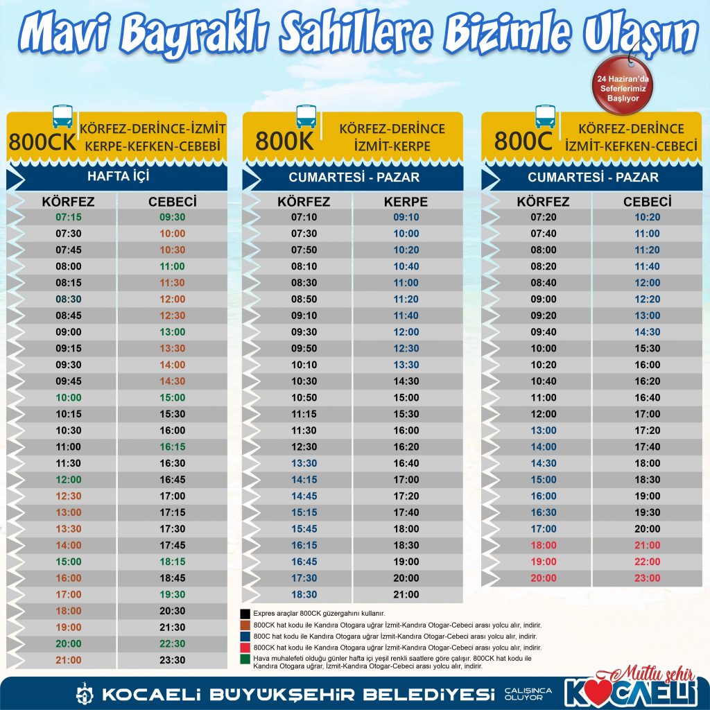 800C hattı ile vatandaşlar, Körfez, Derince, İzmit, Kefken ve Cebeci güzergâhında seyahat edebilecek. Körfez’den ilk seferini saat 07.20’de yapacak olan 800C, son seferini 23.00’de Cebeci’den gerçekleştirecek. Toplamda 46 sefer yapacak otobüsler vatandaşları Kefken ve Cebeci sahillerine ulaştıracak.
