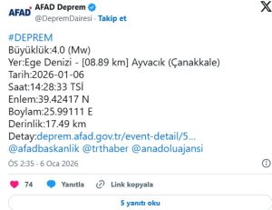 Afet ve Acil Durum Yönetimi Başkanlığı’nın (AFAD) internet sitesinde yer alan bilgiye göre, merkez üssü Ege Denizi Ayvacık ilçesi açıkları olan 4 büyüklüğündeki sarsıntı, yerin 17,49 kilometre derinliğinde gerçekleşti.