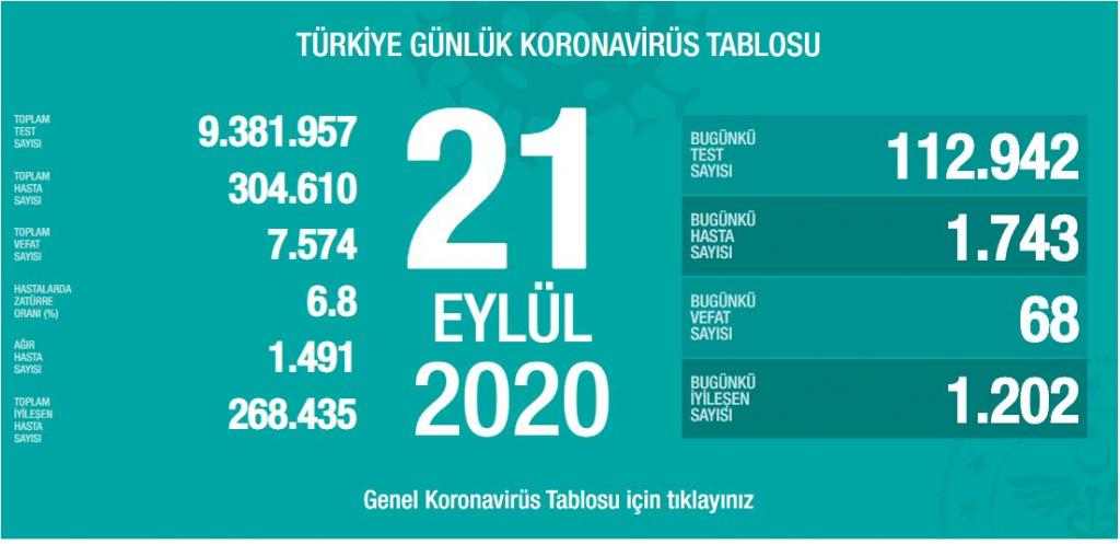 Sağlık Bakanı Fahrettin Koca, 21 Eylül tarihine ait Türkiye’deki korona virüs hasta ve vefat sayısını açıkladı. Bakan Koca’nın açıkladığı veriye göre Türkiye’de bugün bin 743 yeni hasta tespit edildi, 68 kişi ise hayatını kaybetti.
