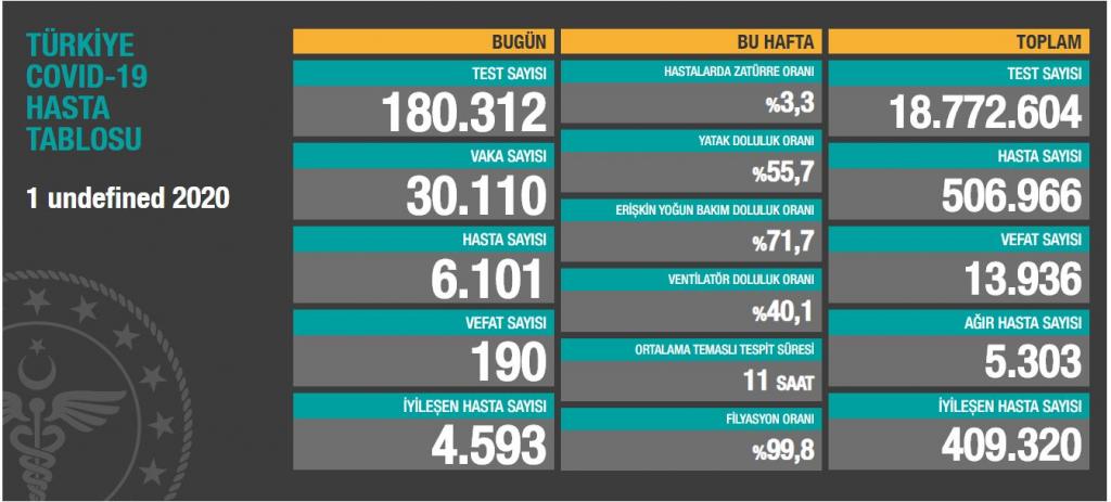 Sağlık Bakanı Fahrettin Koca, 1 Aralık tarihine ait Türkiye’deki korona virüs hasta ve vefat sayısını açıkladı. Bakan Koca’nın açıkladığı veriye göre Türkiye’de bugün 30 bin 110 kişiye korona virüse yakalandı. 190 kişi de korona virüs nedeniyle hayatını kaybetti. Son verilere göre hem vaka sayısında hem de vefat sayısında en yüksek döneme ulaşıldı.