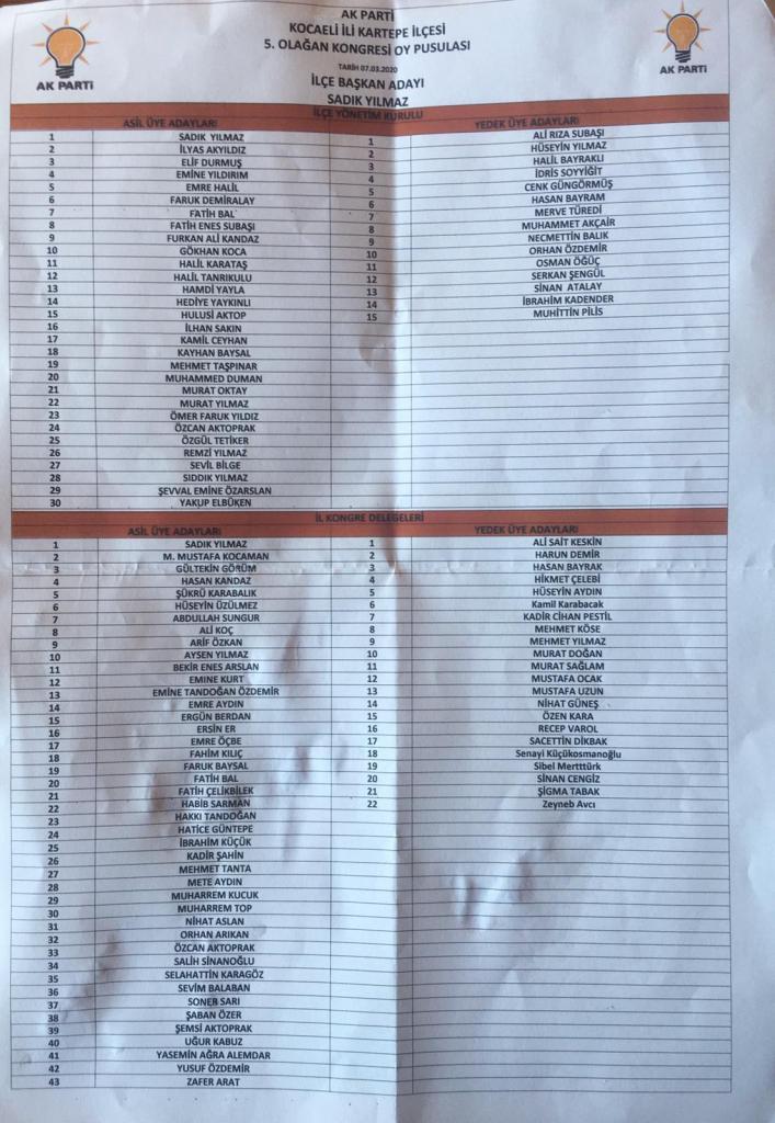 AK Parti’de Karamürsel’den sonra  Kartepe 5. olağan kongresi ile devam etti. Uzunçiftlik Kültür Merkezi’nde yapılan  kongreye mevcut başkan Sadık Yılmaz tek aday olarak girdi.