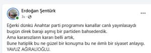Ak Parti eski yöneticilerinden Erdoğan Şentürk, Ak Parti’den istifa etmişti. Şentürk istifa sonrası siyasi çalışmalarda bulunmamıştı. Şentürk, Yavuz Ağıralioğlu’nun partisi Anahtar Parti’ye göz kırptı.