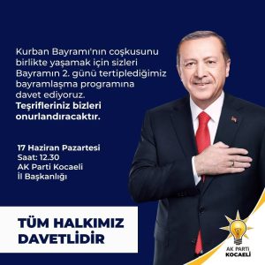 Ak Parti Kocaeli İl Başkanlığı’ndan davet. Ak Parti İl Başkanlığı teşkilat mensuplarını ve vatandaşları bayramlaşmaya davet etti.