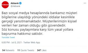 “Bazı sosyal medya hesaplarında bankamız müşteri bilgilerine ulaşıldığı yönündeki iddialar kesinlikle gerçeği yansıtmamaktadır. Müşterilerimizin kişisel verileri her zaman olduğu gibi güvendedir. Söz konusu paylaşımlara karşı tüm yasal yollara başvurma hakkımız saklıdır.”