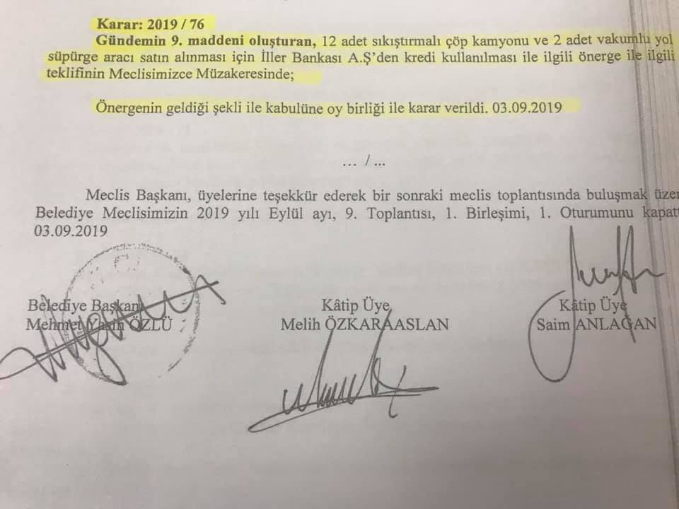 Ekte sunduğum Başiskele Belediye Meclisinin 2019/76 Esas sayılı meclis kararından da görüleceği üzere yine AKP’li Belediye meclis üyeleri konu kendi belediyelerine araç alımı konusunda kredi almak üzere yetki vermiş bulunmaktadırlar.