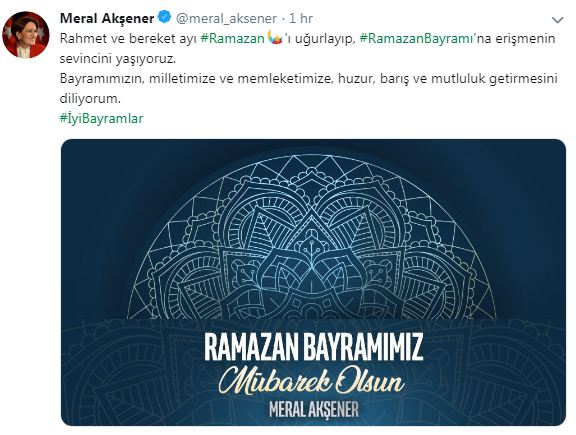 İYİ Parti Genel Başkanı Meal Akşener, sosyal medya hesabından Ramazan Bayramını kutladı.