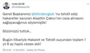 “Genel Başkanımız Kılıçdaroğlu’nu tehdit edip hakaretler savuran Alaattin Çakıcı’nın ceza almasını sağlayacağımızı söylemiştik! Sözümüzü tuttuk.. Bugün itibariyle Hakaret ve Tehdit suçundan toplam 1 yıl 8 ay hapis cezası aldı!”