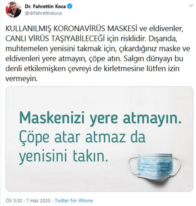 Sağlık Bakanı Fahrettin Koca, kullanılmış maske ve eldivenlerin canlı virüs taşıyabileceği uyarısında bulunarak, ‘Çıkardığınız maske ve eldivenleri yere atmayın, çöpe atar atmaz da yenisini takın’ dedi.