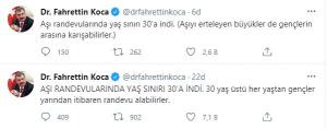 Sosyal Medya00Sağlık Bakanı Fahrettin Koca, yarından itibaren 30 yaş üstü vatandaşların randevu alabileceğini açıkladı. 30 Yaş ve ÜstüAşıAşı AçıklamasıAşıda GelişmeAşıda Yaş 30'a DüştüAşılamaBakan KocaFahrettin KocaSağlık Bakanlığı