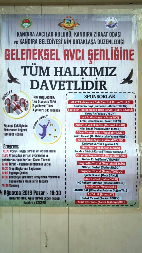 Kandıra Avcılar Kulübü Derneği, Kandıra Ziraat Odası ve Kandıra Belediyesi tarafından ortaklaşa düzenlediği Geleneksel Avcı Şenliği, 4 Ağustos 2019 Pazar günü saat 10:30 da Akdurak Mahallesi Kışla Mevkii Uçbey Tepesinde gerçekleştirilecek. Kandıralı işadamlarının sponsorluğunda düzenlenecek olan şenlikle 2019-2020 yılı av sezonunu açacak olan Kandıralı avcılar, yeni sezonda da korumacı avcılık ilkelerine sadık kalarak avlanmaya devam edecek. Vefat eden avcılar ve şehitlerimiz için Mevlid-i Şerif okutulacak olan şenlik, ikram, trap atış yarışması, piyango çekilişi ve dereceye giren avcılara sürpriz hediyelerin verilmesi ile sonlandırılacak.