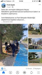 İzmit Belediye Başkanı Av. Fatma Kaplan Hürriyet’ten dün istediği bank bakımı ve boyamasını bugün yerine getirdiği için teşekkür eden Ayazma Mahalle Muhtarı Fırat Çiçek, “Hizmetlerinden çok memnunuz. Bir dediğimizi iki etmiyor” dedi