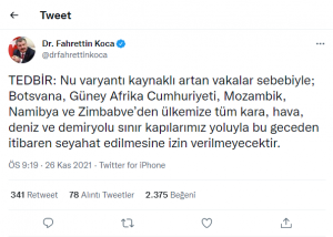 Sağlık Bakanı Fahrettin Koca Twitter’dan yaptığı açıklamada, “TEDBİR: Nu Varyantı kaynaklı artan vakalar sebebiyle; Botsvana, Güney Afrika Cumhuriyeti, Mozambik, Namibya ve Zimbabve’den ülkemize tüm kara, hava, deniz ve demiryolu sınır kapılarımız yoluyla bu geceden itibaren seyahat edilmesine izin verilmeyecektir” ifadelerini kullandı.