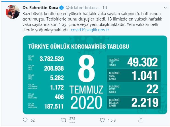 Sağlık Bakanı Fahrettin Koca, 7 Temmuz tarihine ait Türkiye’deki korona virüs vaka ve vefat sayısını açıkladı. Bakan Koca’nın açıkladığı veriye göre Türkiye’de bugün bin 41 yeni vaka tespit edildi, 22 kişi ise hayatını kaybetti.