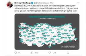 Sağlık Bakanı Fahrettin Koca, sosyal medya hesabından 100.000 nüfusa karşılık gelen il il koronavirüs vaka sayılarını açıkladı. Kocaeli’de vaka sayısının 100 Bin nüfusa karşılık gelen haftalık vaka sayısının 45,26 olduğu görülüyor.