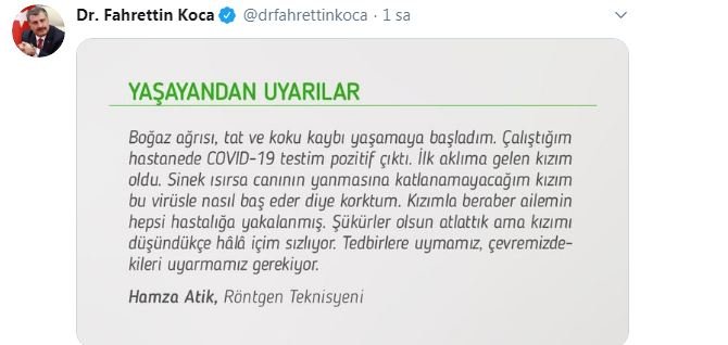 Sağlık Bakanı Fahrettin Koca, sosyal medya hesabından vatandaşları uyarmaya devam ediyor. Bakan Fahrettin Koca, Twitter hesabından, “Yaşayandan Uyarılar” başlığı altında ailesinin ve kendisinin korona virüs testi pozitif çıkan Röntgen Teknisyeni Hamza Atik isimli bir vatandaşın yaşadıklarını anlattığı mesajla uyarıda bulundu.