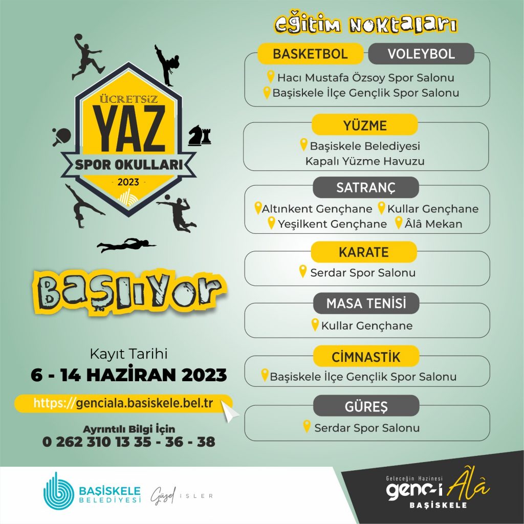 Başiskele Belediyesi Gençlik ve Spor Hizmetleri Müdürlüğü sorumluluğunda Kocaeli Büyükşehir Belediyesi, Başiskele Kaymakamlığı’na bağlı Gençlik Hizmetleri ve İlçe Spor Müdürlüğü ile İlçe Milli Eğitim Müdürlüğü iş birliğiyle gerçekleştirilecek Yaz Spor Okulları’na başvurular 6 Haziran’da başlarken son başvuru tarihi 14 Haziran Çarşamba günü mesai bitimi olarak belirlendi.