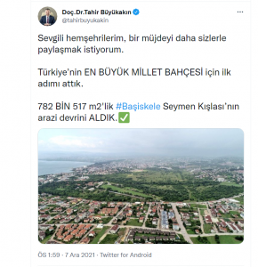Başkan Büyükakın, Başiskele Seymen Kışlası’nın Millet Bahçesi yapılmak üzere Büyükşehir’e tahsisini sosyal medyasından müjdeledi. Sosyal medya hesabından paylaşımda bulunan Başkan Büyükakın, Başiskele’ye yapılacak Millet Bahçesi’nin hayırlı olması dileklerini iletti. Başkan Büyükakın, ‘’Sevgili hemşerilerim, bir müjdeyi sizlerle paylaşmak istiyorum. Türkiye’nin en büyük millet bahçesi için ilk adımı attık’’ ifadesini kullandı.