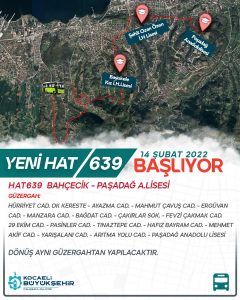 Başiskele Belediye Başkanı M. Yasin Özlü’nün girişimleriyle Kocaeli Büyükşehir Belediyesi Ulaşım Daire Başkanlığı tarafından 639 numaralı yeni toplu ulaşım hattının 14 Şubat 2022 Pazartesi günü hizmete başlayacağı duyuruldu.