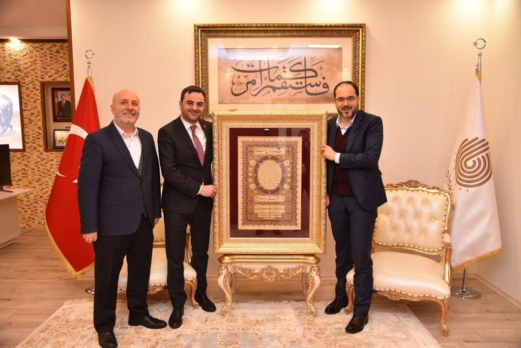 Başkan Hüseyin Ayaz, ziyaret sonrası Mehmet Yasin Özlü’ye başarılar dilerken kendisine bir tablo hediye etti.