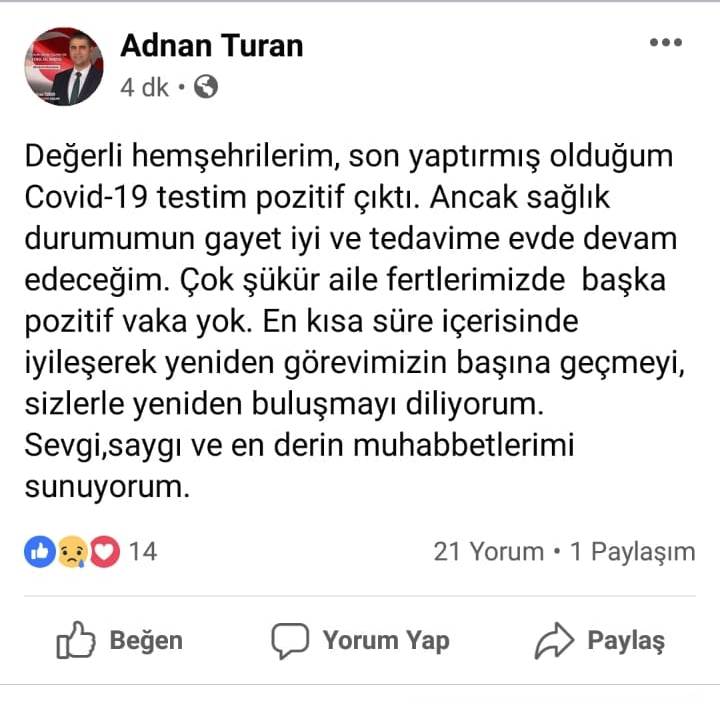 Kocaeli Kandıra İlçesinin sevilen genç Belediye Başkanı Adnan Turan,   sosyal medya hesabından yapmış olduğu paylaşımında, kısa bir süre önce yaptırdığı Covid-19 testinin pozitifi çıktığını duyurdu.  Turan iyi olduğunu belirttiği paylaşımında şu ifadeleri kullandı. ” Değerli hemşehrilerim, son yaptırmış olduğum Covid-19 testim pozitif çıktı.  Ancak sağlık durumum gayet iyi ve tedavime evde devam edeceğim.  Çok şükür aile fertlerimizde başka pozitif vaka yok. En kısa süre içerisinde iyileşerek yeniden görevimizin başına geçmeyi, sizlerle yeniden buluşmayı diliyorum. Sevgi, saygı ve en derin muhabbetlerimi sunuyorum