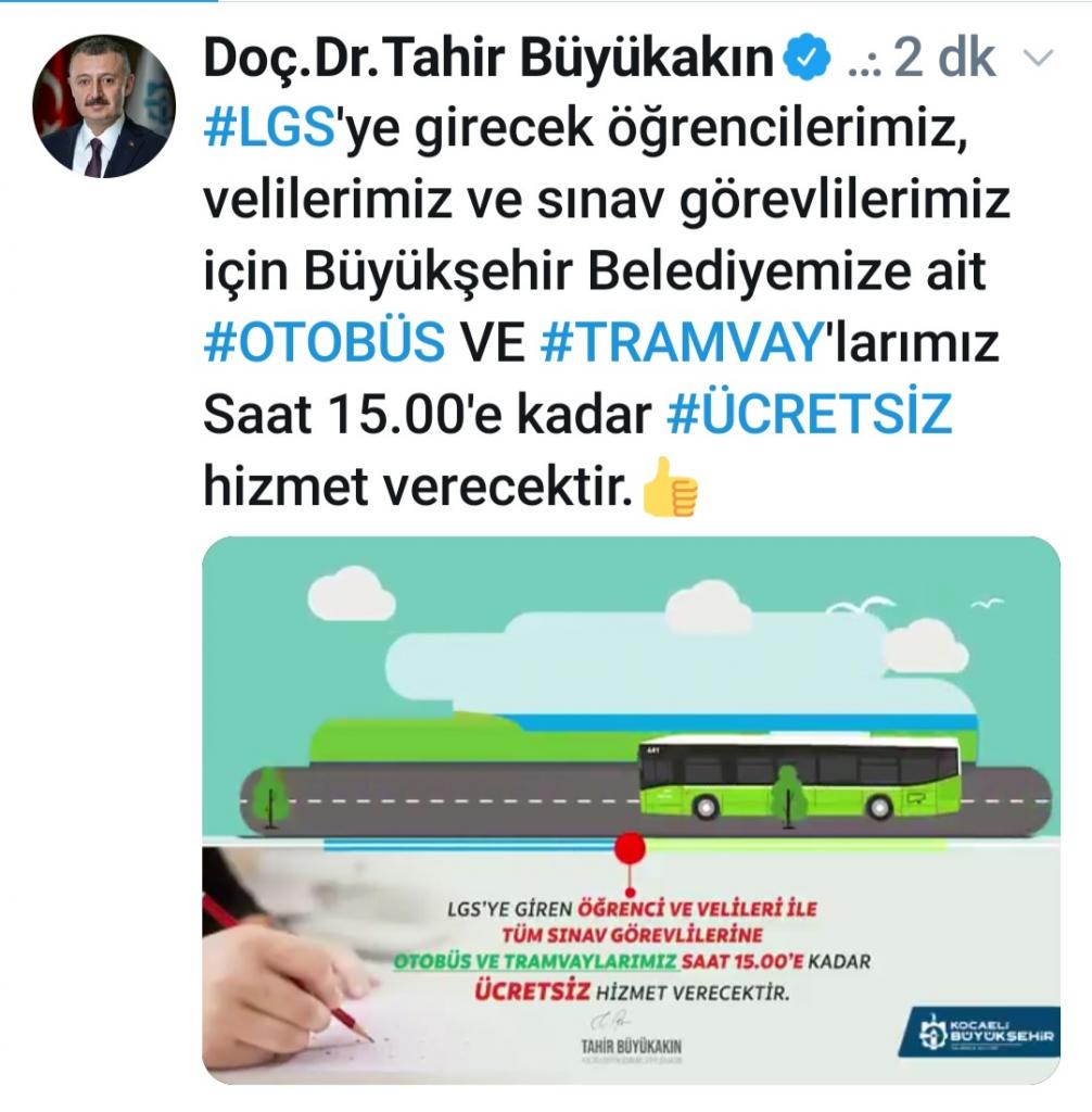 Liselere Geçiş Sistemi (LGS) sınavına girecek öğrencilerin gönül rahatlığıyla sınav yerine gidip evlerine dönmeleri için Kocaeli Büyükşehir Belediyesi Başkanı Doç. Dr. Tahir Büyükakın’dan bir müjde geldi. Başkan Büyükakın’ın talimatı ile 20 Haziran Cumartesi günü yapılacak sınavda öğrenciler ulaşımlarını Büyükşehir Belediyesi toplu taşıma araçlarından saat 15.00’a kadar ücretsiz olarak yapabilecek. Aynı gün yoğunluğun olacağı noktalara da ek seferler konularak sosyal mesafe sağlanarak yolculuk edilmesi sağlanacak.
