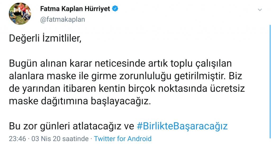 Başkan Hürriyet sosyal medya hesabından yaptığı açıklamada şu ifadeleri kullandı. “Kıymetli İzmitliler, bugün alınan karar neticesinde artık pazar yeri, market ve toplu olarak çalışılan işyerlerine vatandaşlarımızın ve çalışanların maske ile girme zorunluluğu getirilmiştir. Yarından itibaren cumartesi pazarı girişinde ve kentin birçok noktasında ücretsiz maske dağıtımı başlatacağımızı bildirmek isterim. Bu zor günleri de sağlığımızı koruyarak atlatacak, BirlikteBaşaracağız”
