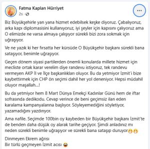 İzmit Belediye Başkanı Fatma Kaplan Hürriyet, sosyal medya hesabından yaptığı paylaşımla isim vermeden  Kocaeli Büyükşehir Belediye Başkanı Tahir Büyükakın’ı ve Ak Parti’yi hedef aldı.