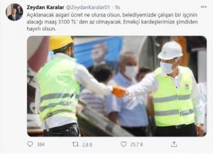 Karalar, Twitter hesabından yaptığı açıklama ile belediye çalışanlarına vereceği asgari ücretin 3 bin 100 TL olacağını açıkladı.
