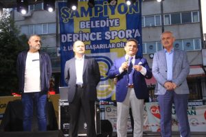 Play-off şampiyonu olarak 2.Lig’e yükselen Belediye Derincespor kent meydanında vatandaşlarla birlikte şampiyonluk kutlaması yaptı. Kulübü devralan yönetimin söz sahibi olduğu kutlamada eski başkan Ahmet Güntepe sahneye çıkmadı.