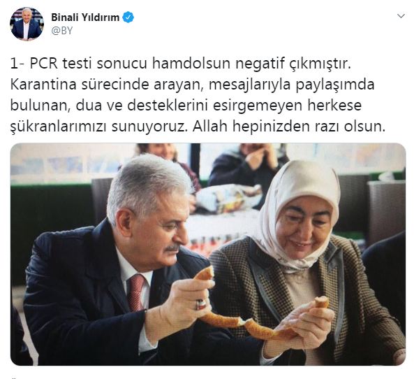 Daha önce korona virüs testi pozitif çıkan AKP İzmir Milletvekili Binali Yıldırım sağlık durumuyla ilgili son bilgileri paylaştı. Yıldırım, son yapılan testinin negatif çıktığını açıkladı.