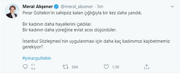 İYİ Parti Genel Başkanı Meral Akşener, Gültekin’in vahşice öldürülmesinin ardından, “Pınar Gültekin’in sahipsiz kalan çığlığıyla bir kez daha yandık. Bir kadının daha hayallerini çaldılar. Bir kadının daha yüreğine evlat acısı düşürdüler. İstanbul Sözleşmesi’nin uygulanması için daha kaç kadınımızı kaybetmemiz gerekiyor?” ifadelerini kullandı.