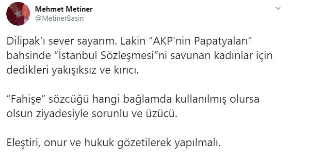 Eski AKP Milletvekili Mehmet Metiner de sosyal medya hesabından Dilipak’a yanıt verdi. Metiner, şunları kaydetti: