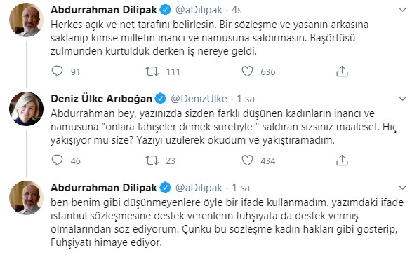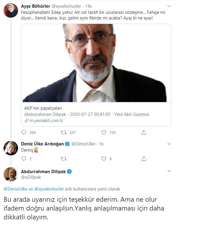 Abdurrahman Dilipak’ın “fahişe”li yazısına AKP kurucularından Yeni Şafak yazarı Ayşe Böhürler’den sert tepki geldi. Böhürler Twitter hesabından Dilipak’ın yazısını “Fesüphanallah! Edep yahu! Alt üst tarafı bir uluslararası sözleşme… Fahişe mi diyor… Kendi karısı, kızı, gelini aynı fikirde mi acaba? Ayıp ki ne ayıp!” notuyla paylaştı.