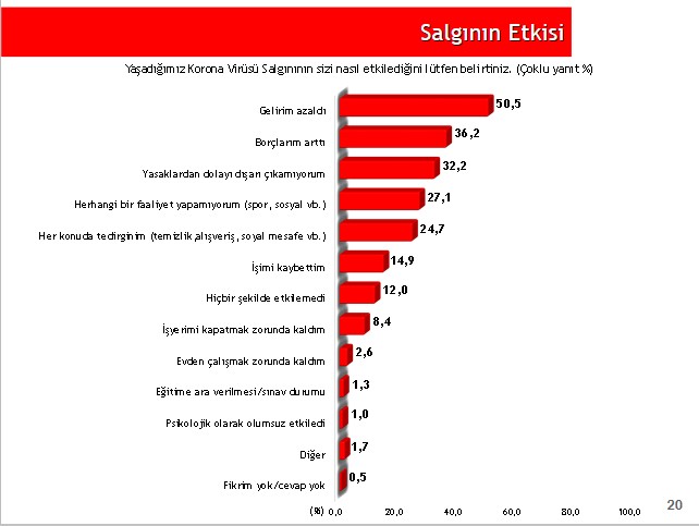 Ankete katılanlara salgından nasıl etkilendikleri sorusu yöneltildi. Katılımcıların yüzde 50,5’i “gelirim azaldı”, yüzde 36,2’si “borçlarım arttı” cevabını verirken yüzde 14,9’u ise “işimi kaybettim” cevabını verdi. “Hiçbir şekilde etkilenmedim” diyenlerin oranı ise yüze 12 olarak kaydedildi.