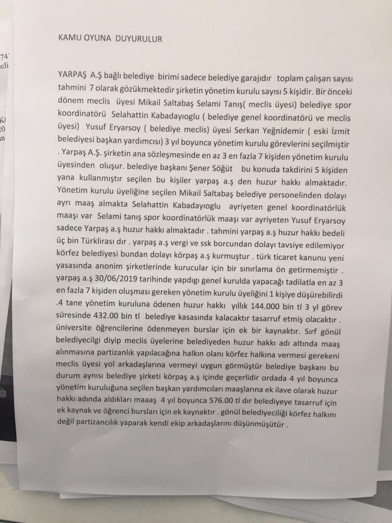 Körfez Meclis Üyesi Erkan Uygun, Körfez Belediyesi şirketleri olan Yarpaş ve Körpaş A.Ş’de neler yaşandığını açıkladı.