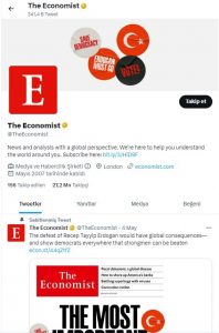 Ak Parti Kocaeli İl Başkanı Şahin Talus Twitter hesabında paylaştı. Talus yaptığı paylaşımda, ‘Bu seçim neden önemli, Cumhurbaşkanımızın gitmesini kimler istiyor? İşte size bir örnek: Cumhurbaşkanımız Sayın Recep Tayyip Erdoğan’ı kapağına taşıyarak hedef alan İngiltere merkezli The Economist dergisi Türkiye’ye şimdi de Twitter kapak görselinde, “Erdoğan gitmeli” ifadelerine yer vererek saldırdı. İfadelerini kullandı.
