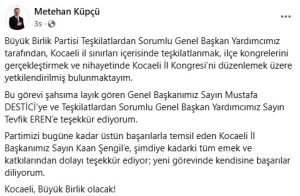 Büyük Birlik Partisi Kocaeli İl Başkanlığı’na Metehan Küpçü atandı. Yeni il başkanı Metehan Küpçü, yeni görevlendirmeyi sosyal medya hesabından duyurdu.