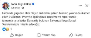 Kocaeli Büyükşehir Belediye Başkanı Tahir Büyükakın, çöken binanın yakınında bulunan evlerden tahliye dilen vatandaşların Darıca’da bulunan Balyanoz koyu sosyal tesislerinde misafir edileceğini duyurdu.