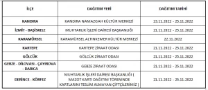 Buna göre, 21 kasım Pazartesi gününden itibaren İzmit ve Başiskele ilçelerindeki çiftçiler fuar içindeki Muhtarlık İşleri Daire Başkanlığı’ndan, Kartepe ve Gölcük’teki üreticiler ilçelerin ziraat odalarından, Gebze, Dilovası, Çayırova ve Darıca ilçesindekiler de Gebze Ziraat Odası’ndan, Karamürsel’deki çiftçiler 22 Kasım Salı gününden itibaren Karamürsel Altın Kemer Kültür Merkezi’nden, Kandıra’daki üreticiler ise 23 Kasım Çarşamba gününden itibaren Kandıra Namazgah Kültür Merkezi’nden, düzenlenen törende kartlarını alamayan Körfez ve Derince’deki çiftçiler de kartlarını Muhtarlık İşleri Daire Başkanlığı’ndan kimliklerini ibraz ederek akaryakıt destek kartlarını teslim alabilecekler. Dağıtım yerleri ve tarihleri ayrıca çiftçilere SMS yoluyla bildirilecek.