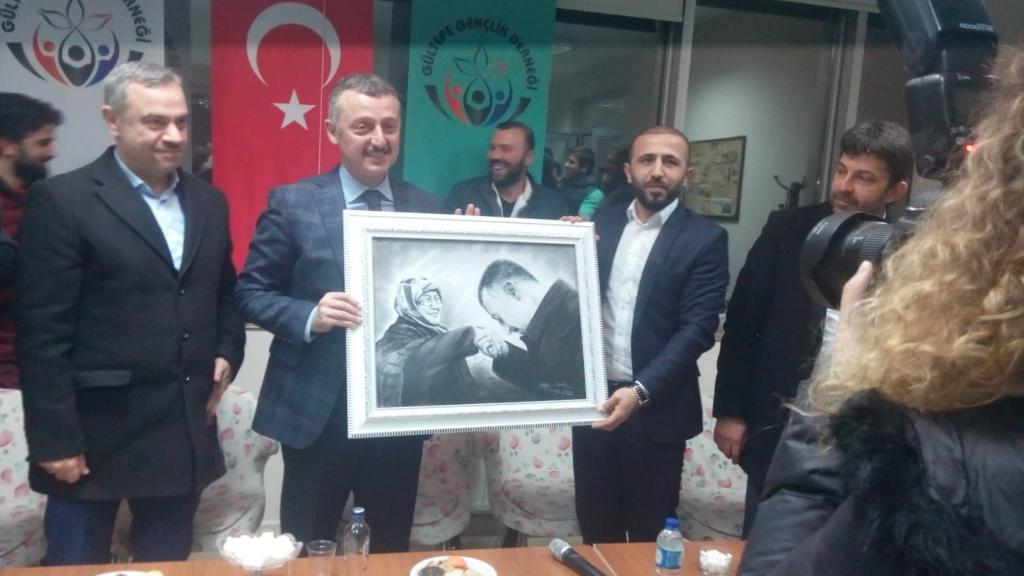 Program sonunda Başkan Fahri Kazancı ve yöneticiler Büyükakın’a annesinin elini öptüğü kara kalem resmi hediye ettiler.