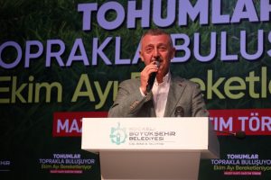 Büyükşehir Belediye Başkanı Tahir Büyükakın programda yaptığı konuşmada, 4,5 yılda 58 önemli tarımsal destekleme projesini hayata geçirdiklerini, üreticilere yaklaşık 450 milyon TL değerinde destek sağladıklarını söyledi. Bugün burada ekim ayı içerisinde, hibe akaryakıt, yem bitkisi tohumu ve sera yapımı projelerinin teslimini yapacaklarını belirten Başkan Büyükakın, “Bir ülke, bir şehir, bir organizasyonda ortak bir niyet etrafında birleşirlerse maksatlar bir olursa, yürekler aynı ritimde atarsa başarılı sonuçlar elde ediyoruz. Önemli olan maksat birliğidir. Türkiye Cumhuriyeti’nin 100. yılında, yeni yüzyılda büyük bir seferberliğin içindeyiz. Biz geleceğin büyük Türkiye’sini inşa edecek adımlarla yürüyoruz. Biz geçmişte, ilimle ve Anadolu insanının irfanıyla bunları başardık. Ve biz yeniden böyle bir şey yapmanın yegane namzetiyiz. Biz büyük bir medeniyetin mirasçılarıyız” diye konuştu.