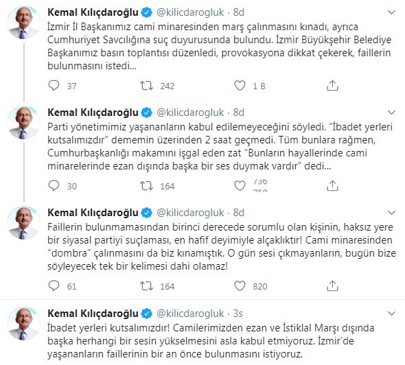 Cumhrubaşkanı Erdoğan’ın camide şarkı çalınmasına ilişkin CHP’li yöneticileri hedef göstermesine cevap CHP Genel Başkanı Kemal Kılıçdaroğlu’ndan geldi. (Bu tweetlerin tamamı Kılıçdaroğlu’nun resmi hesabından alınmıştır.)